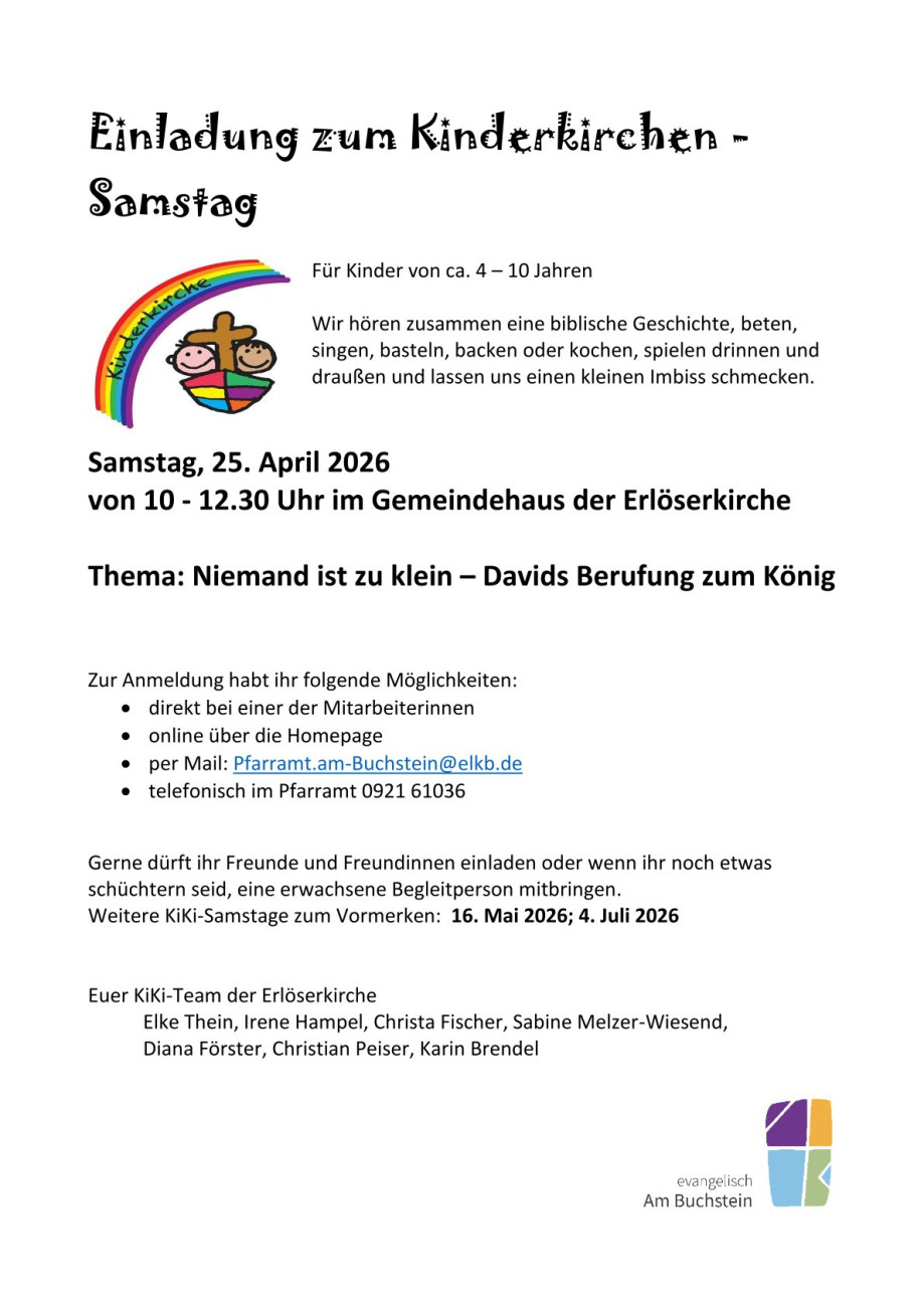 Herzliche Einladung zum nÀchsten Kinderkirchensamstag am Samstag, den 25. April von 10.00 -12.30 Uhr im Gemeindehaus der Erlöserkirche.