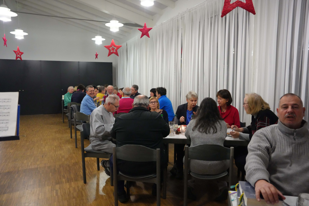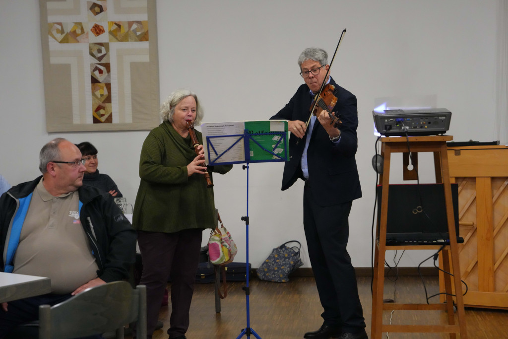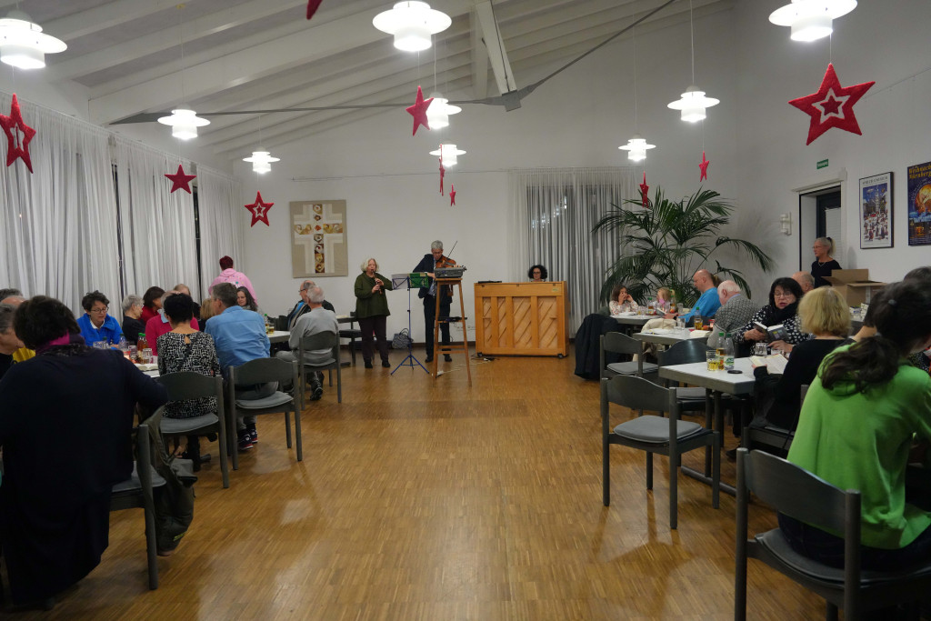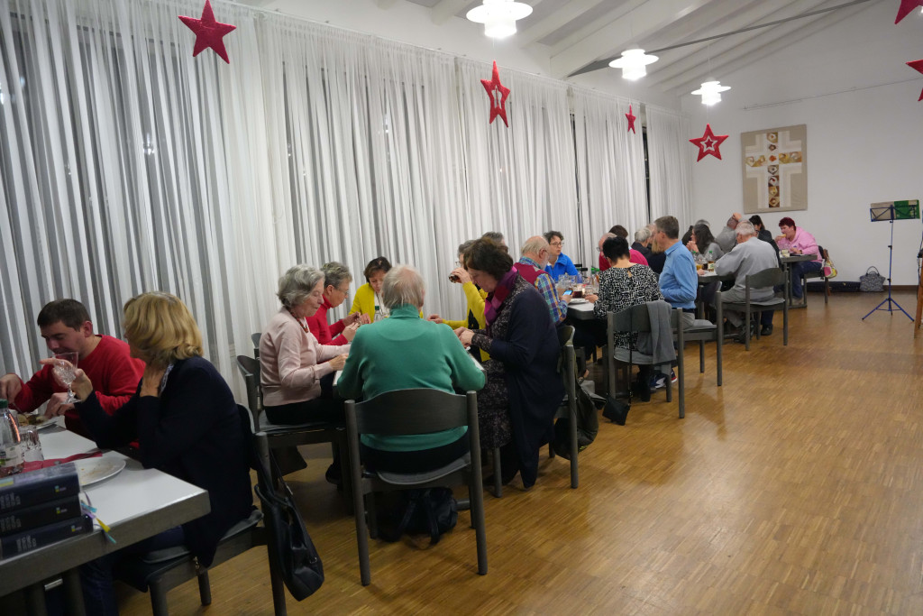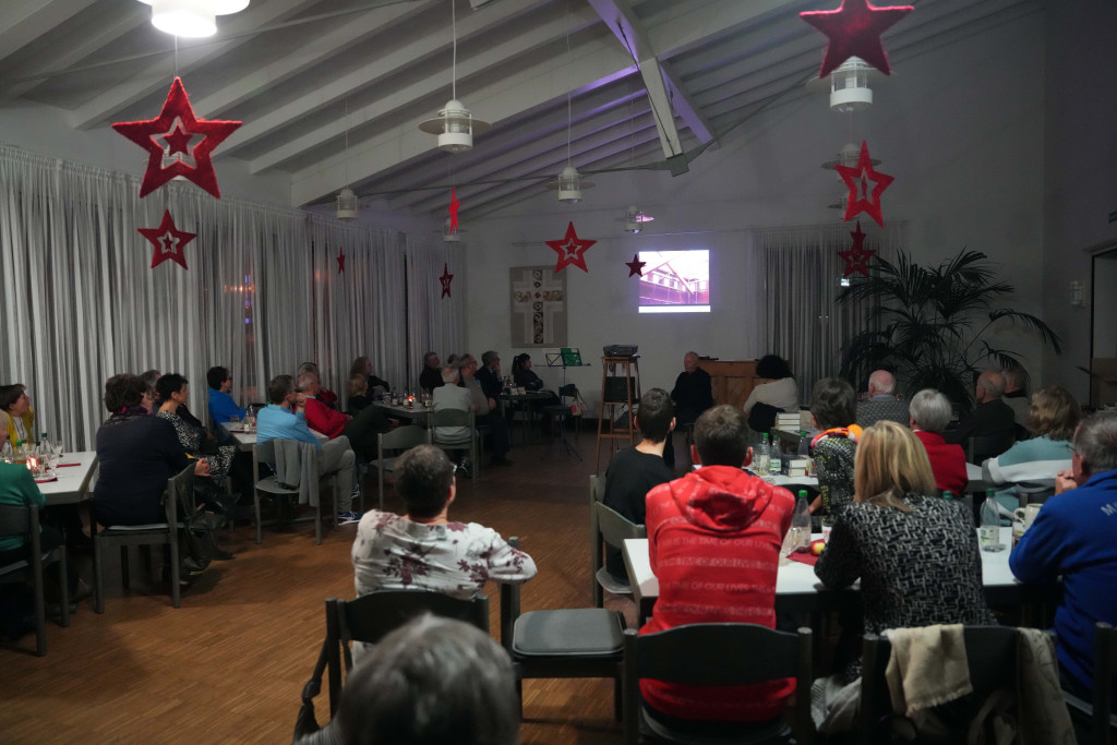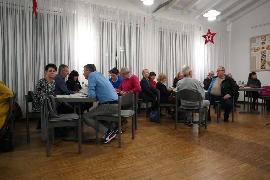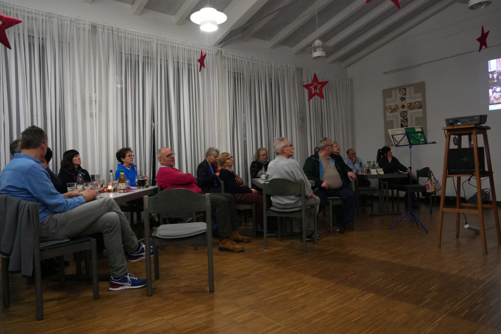 Es war ein geselliger Abend mit einem leckeren Buffet und anregenden Gesprächen. Zwischendurch gab es einen bewegenden Film- Vortrag von Herrn Fuchs zum Kirchenbau in der 60-er Jahren sowie manche launige musikalischen Beiträge.
