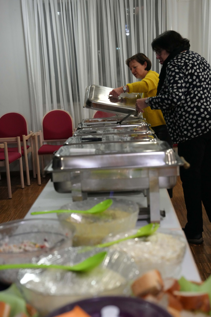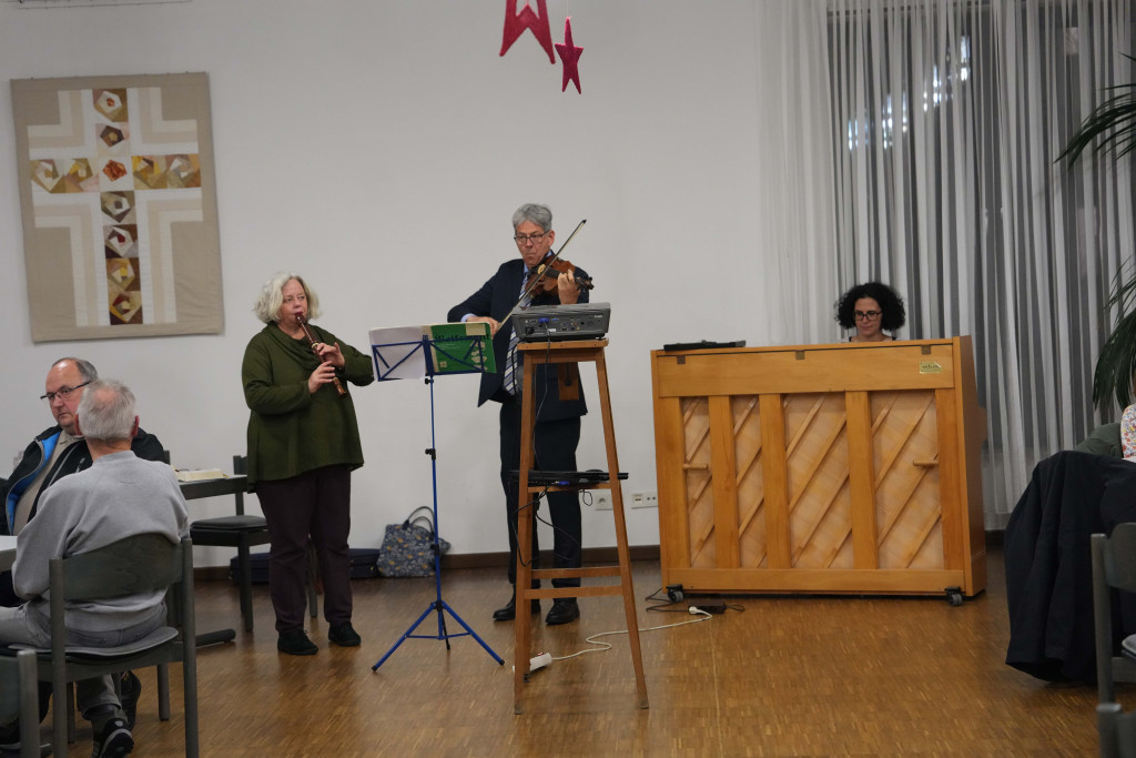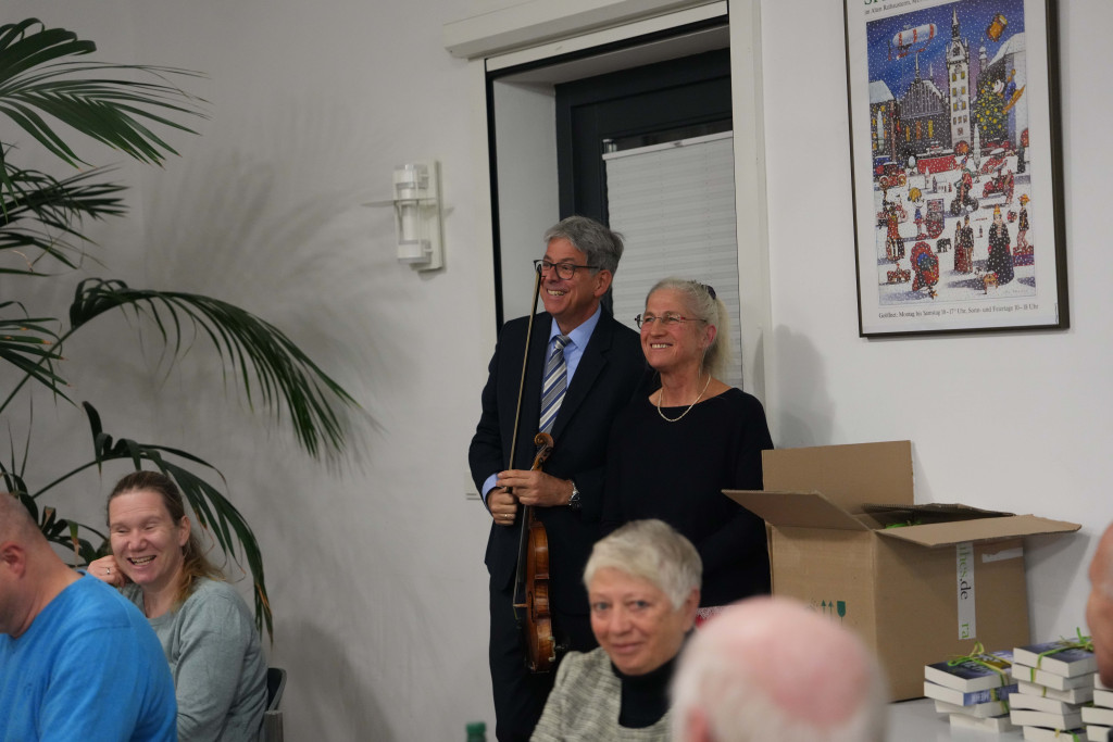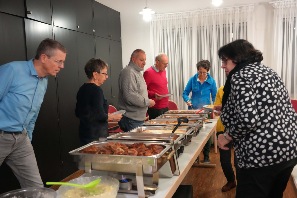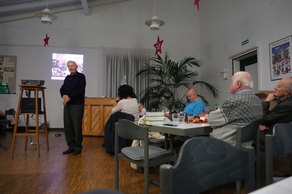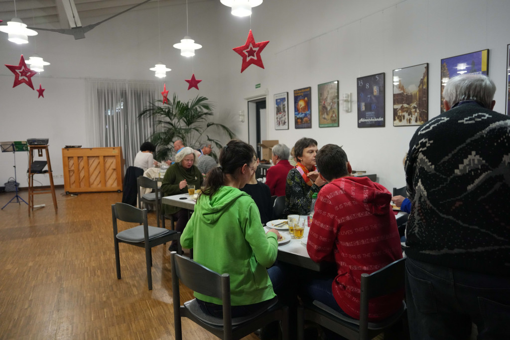 Es war ein geselliger Abend mit einem leckeren Buffet und anregenden Gesprächen. Zwischendurch gab es einen bewegenden Film- Vortrag von Herrn Fuchs zum Kirchenbau in der 60-er Jahren sowie manche launige musikalischen Beiträge.